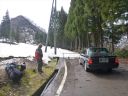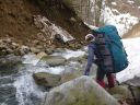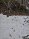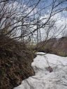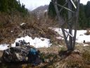| 雪解けで国道に溢れて流れる東屋沢の水は深く、国道を石飛びでは渡れそうになかった。石の隙間に嵌りながら東屋沢の残雪を右岸を登って対岸の赤テープを目印に、沢の岩を踏んで渡って、崩落した残雪を足がかりに左岸の泥崖を木の根を掴んでよじ登った。左岸を下って標高点738mに下りついた。国道の端に大石を2、3置くだけでさらに安全に東屋沢を通過できると思うが無理な注文か。ここは国道の要所である。 |