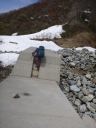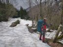 | 残雪と雪解けで現れた路肩を踏んで国道を進む。晴天、無風で周りの木々が明日にも芽を吹きそうな気配が高まっていた。右手上には清水峠の送電線監視所が見える。前回(もう大昔だが)流失していた謙信尾根に渡る橋は今回も目に止まらなかった。 残雪を踏んで檜倉沢に出た。沢の風景は一変していた。沢を下から上に眺めると防災のためか大きな堰堤が幾つか見えた。最下流の堰堤の取り付きが雪に覆われた広場になっていて車道の終点と思われた。木造のベンチが登って来た車道の角に備わっている。檜倉沢には豊富な雪解け水が流れ下っていた。 |