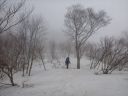 | 《04/06》夜半に小用に起きてテントの外に出ると、空には星が瞬き、麓には町の明りが黄色に輝いていた。朝の好天を期待して寝袋に潜り込む。ところが夜明けに近づくにつれ風も強くなり、フライに当る雪の音も次第に大きく、気温も低下してテントの内側に霜が着き出した。朝食を終えて装備を整えテントから出てみると10m先が見えない。西から雲が流れ、風で潅木に霧氷ができつつあった。寒い。指がかじかんで痛くなってきた。 |