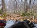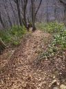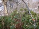 | 旧国道291号線(標高1200m)に登りついて休憩した。見下ろすとミズナラやブナの高木が石楠花などの薮の上に立っていた。いつの間にか太陽を雲が覆い山が暗くなってきた。旧国道には残雪がへばりつきにここより標高がある場所には雪があることを示していた。 |