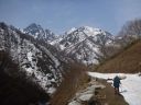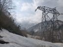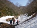 | 下りついた送電線鉄塔で少し長い休憩を取った。見れば青空が谷川岳側に広がっている。まだ白雲の動きは早い。檜倉沢左岸の崖についた夏道を往路と同じように冷や冷やしながら抜けて、残雪の斜面を下って檜倉沢に降り立った。堰堤の上から谷の奥を見上げると檜倉山から柄沢山に至る稜線が青空の下に白く光っていた。数時間早く雲が去ってくれていたらと思うが時間切れとはこんなものだ。 車道の末端からは残雪の国道を歩む。桑ノ沢で谷奥を望遠鏡で見ている人たちに会った。熊狩り中ということだ。「秋にブナの実が大豊作だったので春になっても熊が木に登らない。見つけるのが難しい」とのことであった。話を聞いている最中にも後続の人たちが猟銃を背負って登って来た。新潟安全狩猟の会の皆さんは皆、立派な尻皮を着けていらっしゃった。謙信尾根の向かいを過ぎると懐かしい大源太山が鋭い峰を青空に向けているのが見えた。次第に陽射しが強くなる。東屋沢は雪解け水を一層溢れさせている。往路と同じ渡渉点に登って右岸に渡った。残雪が腐って来て石の間の間に足が落ち込むので国道まで注意して下らなければならなかった。 |