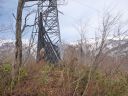 | 巻き道を進んで尾根末端を回りこんだところに送電鉄塔(標高930m)がある。小さなせせらぎが流れる広場の脇に幾つもの切り株や伐採された丸太の山が残っている。日だまりに腰を下ろして行動食を取った。 |