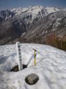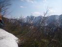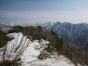 | 残雪を踏んで最後の薮を抜けるとQさんがそこが待つ威守松山の山頂(3等三角点、1214.2m)であった。展望がすばらしい。巻機山が北東に聳え、巻機山から谷川岳に至る主稜線、谷から六日町方面に至る山麓が見えた。10分近く展望を楽しんだ後、急な登山路を注意して下った。急いだのは旅館のチェックイン時刻をQさんが配慮したこともある。 |
