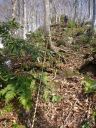 | 木の根、細枝を掴んでどうにか尾根に上がる。尾根筋は激しい薮でしかも上に向かって次第に狭くなり左右は崖となっていた。少し進むとさらに、酷い柘植の薮が二ヶ所もあったが崖に降りて巻くわけにも行かず、先を登るQさんが薮を踏む音を頼りに登るしかなかった。 酷い薮尾根を登り、平坦な笹薮を抜けて主稜線に合流する。なんとそこには高木林の中に広い徒歩道があった。徒歩道に座り込んで汗を拭い息を整えた。主稜線の先に標高点858mらしい峰が見える。 |