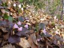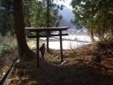 | 二ヶ所の分岐、高圧線鉄塔、858mの小ピークを過ぎて往路で合流した西尾根・北尾根分岐に到着した。このまま広い登山路を進むことにして落葉が積もった急な徒歩道を固定ロープを補助にしながら下った。徒歩道の左右にはイワウチワが開花していた。標高700m付近に下りると奥社と思われる社がある。参拝する人のためか杉人工林の中に歩き易い電光道がついている。登山路の傍らに「山頂へ」の道標が落ちていた。周りには雪椿が開花していた。 送電線鉄塔に着いた。その先には鳥居がある。傍に「大神宮様方面」との道標があった。杉林の中にも大神宮様の鳥居があり、前後からの道が通っている。鳥居を出ると広い田畑にになり残雪のせいか集落への道がハッキリしない。山裾の用水に沿うか田畑の東端を通るか迷ったが残雪を踏んで東端から集落に直進することにした。通り抜けて車道に降りたらなんと驚くことにそこは清水バス停であった。傍らに立つ大看板の案内図を恨めしく見上げた。なんで大神宮様コースが書いてないのだ。 |