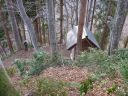 | 清水バス停から右手に神社を2つ、左手に今夜泊まる予定の上田屋旅館を見てイガシラ登山口を探しながら高圧送電線鉄塔の先まで歩いた。道標、踏み跡が見つからない。鉄塔下まで引き返して細かく調べた。 どうにも見つからないので送電線鉄塔下の岩の横に大ザックをデポして沢を渡り、Qさんを先頭に北尾根の急斜面に取り付いた。 |