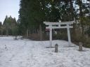 | 荷を背負い、ゲートを過ぎた。舗装道路をショートカットして直ぐに残雪で埋まった分岐に出会う。ここが威守松山の夏道登山口のはずだ。奥にはなにか役所関係の施設がある。そこに行った踏み跡は全く無い。威守松山の残雪期登山口はどこなのだろう。 |