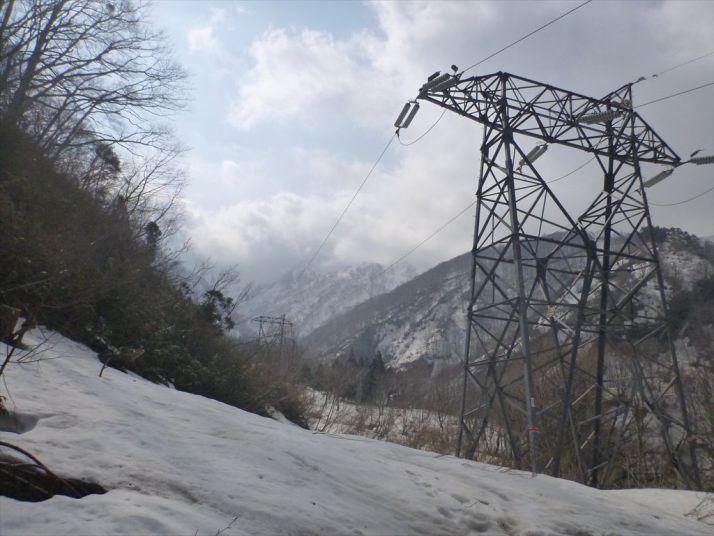 送電線鉄塔脇で休憩、青空が谷川岳側に