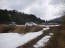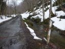 | 大石橋手前の駐車場まで車で到着できることを期待して徳網山登山口を出発した。徳網集落を通り抜ける最中に重機を積んだトラックとすれ違った。末端までの除雪が終わっていると喜んだが、集落を抜けた途端、舗装が切れた地点(標高点421m)でチェインゲートに出くわした。南京錠でガッチリと閉まっている。「なんで」と思ったがしょうがない。 |