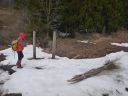 | 標高750mを過ぎてようやく出てきた雪堤を登る。直ぐに薮・泥の急斜面の急斜面に代わった。左右のの草付から見て残雪が崩落した跡とと思われた。抜けて薮尾根を落葉樹、五葉松と反復しながら登り続けた。 |
