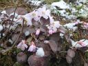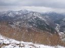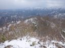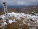 | 山頂から、南西を見て小雪の中を下る。遠くに白く見えるのは飯豊連峰だろうが雪雲でハッキリしなかった。下っていった人たちの踏み跡の上にも小雪が積もり消えかけている。吹雪ではないので尾根筋をしっかり確認できる。主稜線から支尾根への分岐点も行過ぎずに左折した。変化がない広い尾根の薮を化粧雪が隠しているので思っていたようになかなか難しかった。 その後は尾根なりに登山口に下山することができた。登山口は風雪に一変していた。 |