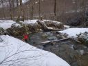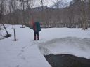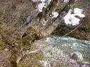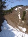 | 無雪期にはなんら障害はないだろうが崖を下って吊橋の白布橋に取り付くのは注意が肝心だった。登り下りに使う補助のロープが雪の中に埋まっているので頼りは木の根と潅木である。白布橋が踏み板一本だがワイヤーを掴んで渡るのは大石橋と同じだ。足元に隙間がないだけ不安がない。 吊橋を渡り終わって残雪の上を歩み、白布沢を渡渉した。例年なら残雪が残って沢とは思わずに通り過ぎるのだろうが・・・。当初幕営予定は白布平であった。重い荷物を背負って吊橋や一本橋を渡るには高齢の我々にはそこそこの問題がある。大石橋駐車場に幕営して良かった。「白布沢から県境尾根に登った記録がある」とQさんは言うが沢から取り付く尾根への斜面(崖か)は暖冬で黒々していた。 |