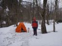 | ゲート外に駐車して大ザックに荷を詰め込んで出発した。2013年秋にマイクロバスで大石橋から下ってきた道を今日は重い荷を背負って登ることになる。除雪済みの舗装路が続くのに再び「何で」と思う。休憩して行動食の餡パンを頬張る。除雪最終点は大石橋寸前の所であった。残雪の上に登り、荒川に向かって下った。記憶にあるトイレが立つ駐車場(420m)に直ぐ着いた。前回は祝瓶山からここまで下ってきてマイクロバスに乗ったのだ。雪上にテントを設営しつつ、沢音と小鳥の囀りを楽しんだ。トイレはドアを板で張ってどうにも利用できなかった。 |