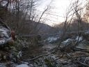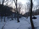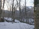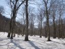 | 薄明にあわせてテントを出た。大石の吊橋を渡って次に沢を渡る。一本橋の上には霜が降りているので靴が滑らないように注意して渡る。次いで右手に三角屋根の小屋をみて夏道の上に積もった雪の上を歩く。 このコースにある美しい平を幾つか通った。ブナの大木が雪の平にに立つ風景はここしかないのかも知れない。平から次の平に移る小沢は渡渉しなければならない。残雪が多ければ何のことはないだろうが今年は渡渉点を探さねばならない。何時ものことだがQさんのトレースがTIには「有り難や」になった。 |