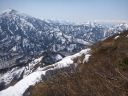 | 激薮を抜けてようやく県境尾根に登りついた。徳網山、針生山から袖朝日岳・西朝日岳に至る尾根だ。昨日、徳網山から見たとおり残雪が消えうせ、薮が続いている。麓からは尾根に雪堤が続いていたように見えていたが尾根に登ってみると雪堤はすでに斜面に落ちて県境尾根には激薮が続いていた。Qさんの調査で「薮をかわした北斜面」にも雪がなく、頼りになる木も疎らな薮が茂る崖であった。落ちたらクワバラ。どこを進めばいいのだ。好天だが空しかった。 |