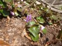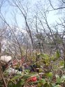 | 再び激薮に突入して尾根を下る。荒川の谷間を鷹が舞うのを見つけたり、カラ・エナガ混群がブナ林を囀りながら移動するを楽しみながら薮や五葉松の尾根を抜けた。取り付きに近づくにつれブナが大木になった。荒川側の斜面にはイワウチワとカタクリが同時に開花していたので、しばし写真撮影タイムとなった。 |