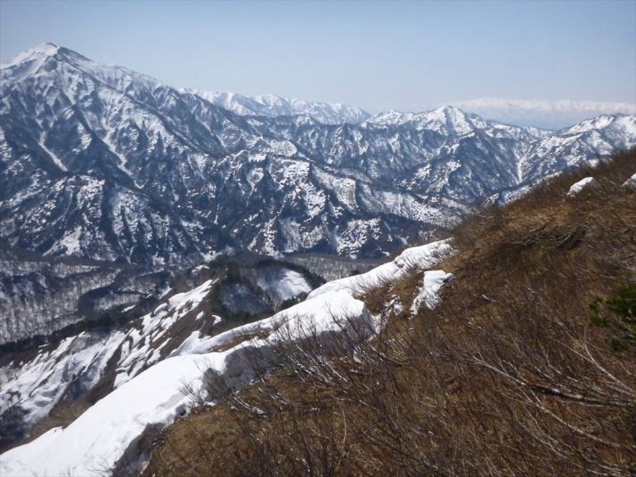祝瓶と飯豊を望む、雪堤は尾根から落ちて遥か下