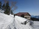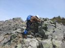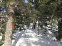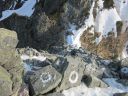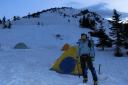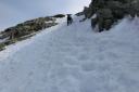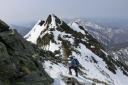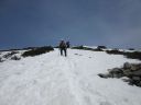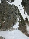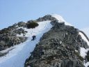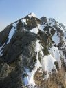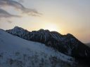 | 【コメント】 岩と雪とアイスのミックスした最初から最後まで緊張度マックスの山だった。 幸い天候に恵まれ、朝も早く出発したため雪がしまっていて、アイゼンと、ピッケルがよく効いた。 これでもかという、いくつものピークを超えてやっと西穂の山頂に着いたときは本当に嬉しかった。 誰もいなかったので思わず山頂標識に抱きついた。 奥穂に続く尾根、奥穂から前穂の吊り尾根もきれいに見えた。しばし360度の景色を楽しんだ。 が、下りの方が難しいため緊張を緩めることなく、長いトラバースも一歩一歩慎重に歩いた。 足の運びをちょっとでも失敗したら、即サヨナラのところばかり。 やっと安心できたのは独標まで戻ってきてから。 独標まで戻ると他の登山者が大勢いた。 ロープも用意していたが使わないですむギリギリの雪の状態だった。 案の定、下山時には気温が上がり雪が緩んできていた。 アイゼン登歩行のいい経験ができた。そして雪山は本当に綺麗で感動的だとつくづく思った。 コメント:M/S |