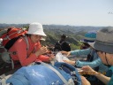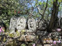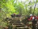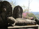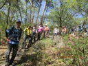 | 【期 日】 2016年4月15日(金) 【メンバー】 L=Y.Y、SL=I.K、T.K、M.K、C.O、Y.S、T.H、T.K、K.Y、Y.I、M.I、M.I、S.F、T.Y、N.U (15名) 【コースタイム】 8:10足利駅発⇒バス⇒8:40行道山バス停着 8:50バス停発→9:30淨因寺 →10:00寝釈迦 、10:20石尊山見晴台→10:50大岩山剣ヶ峰、 →11:00富士山の見えた展望台→11:20最勝寺毘沙門天 、11:25最勝寺下(昼食) →12:00出発→ 12:35北関東自動車道大岩山トンネル上通過 、13:15両崖山 →14:15織姫神社→14:40足利駅 【コメント】 足利駅からバスを30分も乗っても料金は200円と安い。乗客は私達15名だけ。 バスの終点淨因寺を出発。長い石段を登ります。 足の弱い人や横着な人には6人乗りのモノレールが用意されています。料金は500円とか。 階段を登りつめると静かな境内に道行山淨因寺が現れます。 かつては山岳信仰の地として栄え、関東の高野山とも云われました。 向かいの大岩の上には清心亭と呼ばれる葛飾北斎も画いた茶室があり、有料でお茶も立てて くれるそうです。 所々にマムシグサやスミレの生える山道を歩くうちに小高い岩山に着きます。 石仏群の囲まれた中に60cmほどのかわいい寝釈迦がありました。 歩を進め石尊山の展望台で休憩。 ここからは・赤城・榛名・草津などの山が新緑の向うに見えて気持ちがいいです。記念撮影。 更にミズナラの若葉やアオダモの白い花の中を行くと大岩山剣ヶ峰になります。 風が強い日だったので富士山まで望めました。 富士山が見えると何故か感動を覚えるのは不思議ですね。 ヤマツツジやミツバツツジが咲く岩場の尾根道を進むと立派な建物の最勝寺に到着。 信心深くお参りをして、さらに進むと展望のいい場所にでました。ここでゆっくりと昼食。 相変らず良く食べよく喋っていました。 腹と口を満たした後は、大岩山を貫く北関東自動車道のトンネルを下に見て歩き続けると 両崖山に着きます。ここには昔、足利城があったそうです。よくもこんな山の上に城を築いた ものです。 山頂には小さな祠がありました。兵どもが夢の跡です。 ここからは一気に織姫神社に向かいます。 すぐ下には足利市内が見えるのに、アップダウンが多くなかなか着きません。やっと朱色の立派な 社殿が現れました。織姫神社です。 大昔から織物の神を祭ってあります。さすが織物の街足利です。 神社から渡良瀬川を渡り、足利駅まで歩きました。 風は強かったですが、天気も良く新緑の爽やかな山行でした。 |