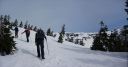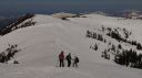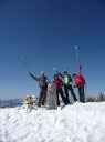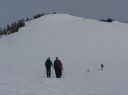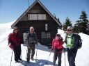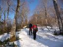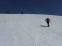 | 【期日】 2016年4月20日(水) 【メンバー】 NK MU 外部2人 【コースタイム】 駐車場4:30―会津駒ケ岳登山口5:05―8:00駒ノ小屋8:40―会津駒ケ岳9:00―9:20中門岳途中9:40― 10:00駒ノ小屋10:10―登山口12:00―駐車場13:00 【コメント】 前夜19日、桧枝岐の民宿「木の実」に泊まる。この民宿の夕食の料理が次から次と出てきて食べきれない。山ぶどうのお手製葡萄ジュースに始まり、ニシン、いわな、てんぷら、春の山菜多種盛り合わせ、自家製シイタケの煮物などなど・・・。トン汁に〆はもち米の山菜混ぜご飯、白米、十割のおばちゃん手打ちそば。デザートは、そば粉の和菓子と バナナ。 ビールや酒もすすみ、明日の会津駒が岳の成功に弾みをつける。 9時就寝。明日は3;30分起床だ。 20日3:30分全員起床。宿のおばちゃんは朝飯替わりのお弁当づくりで、すでに起きていた。 4;00おばちゃんに見送られ、民宿を出る。昨日下見した登山道入り口までの道を車で行く。 入口のゲートがまだ開通していないので、ここから歩きだ。昨日下見した近道の登山道は暗い中の急登のため危ないので登らず、車道をヘッデンをつけて歩く。しばらく歩くと周りが白み始めた。登山道入り口の階段を上り、急登の山道を登りながら30分もすると、日の出。 5;21分。素晴らしく美しいピンクからオレンジの景色に,闇とのコントラストに全員歩みを止め見とれてしまう。 やがて、すっかり太陽が出たころ、雪の少ない夏道沿いに別れを告げ、雪面の樹林帯に入る。樹林帯なので、コースがあるわけではないので、ルートファインテイングしながら登り続ける。相変わらずの急登に変わりがない。要所要所で、磁石を振り方向確認する。 きつい傾斜を登りつめ、8:00に駒の小屋に到着。小屋前で朝食にする。やっと一息つく。後、駒が岳を見定め、駒の小屋から駒が岳に登る。駒の小屋は23日~臨時営業するそうだ。頂上では犬を連れたトレラン風の登山者に写真撮影をお願いした。 頂上からの眺めは素晴らしい。さらに中門岳の方に向かう。もう言葉が出ないほど素晴らしい展望だ。雪の高さで樹林が隠され。360度の展望。青空の中に輝く白一色の白銀の世界。憧れて何十回となく見た雑誌のグラビア写真より、今日の景色は何十倍も美しかった。 帰路は駒の小屋まで後尾で歩く。セッピが張り出している中を歩く仲間の光景が余り にも美しかったので、写真を撮る。 薄氷が張り固い雪面の早朝の登りとはうって変わり、下山は太陽で雪が溶けグサグサ 状態で軽快にとはいかないまでも、それでも下りなので速度は速かった。ラッセルこそ なかったが、雪たっぷりの会津駒が岳に感謝!!晴天に乾杯!! 記:M/U |