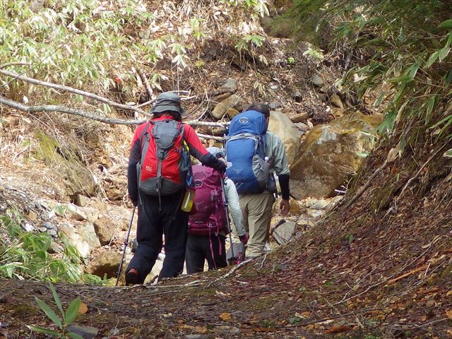 雪のない登山道を進みます