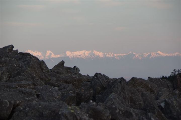 朝日に輝きはじめた北アルプスの主峰群:山座同定を楽しんでみてください。