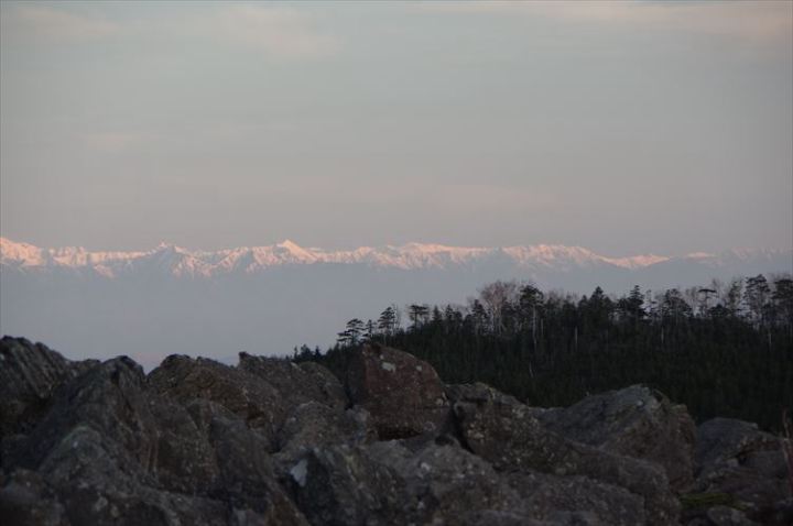 朝日に輝きはじめた北アルプスの峰々・遠く立山・劔も確認できました。