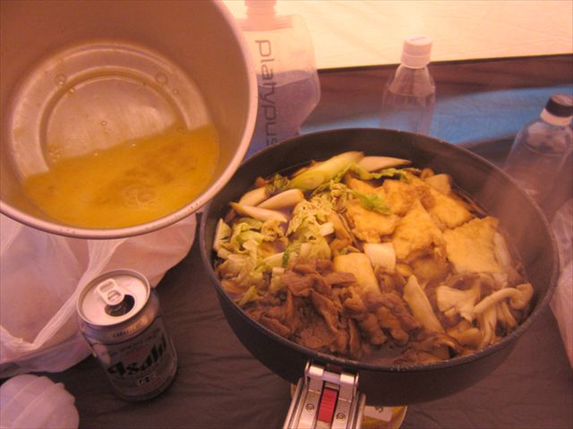すき焼き、豆腐の代わりには油揚げ、卵も持ってきたのですが・・・