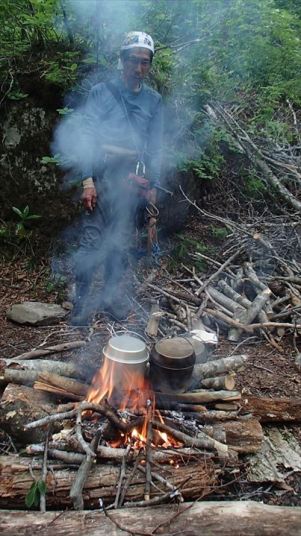 火を起こしてビリー缶を焚火の上に直接置きます おいしいご飯ができますように