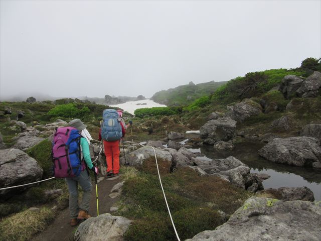 やがてガスが出てきた、岩ゴロの日本庭園を進む