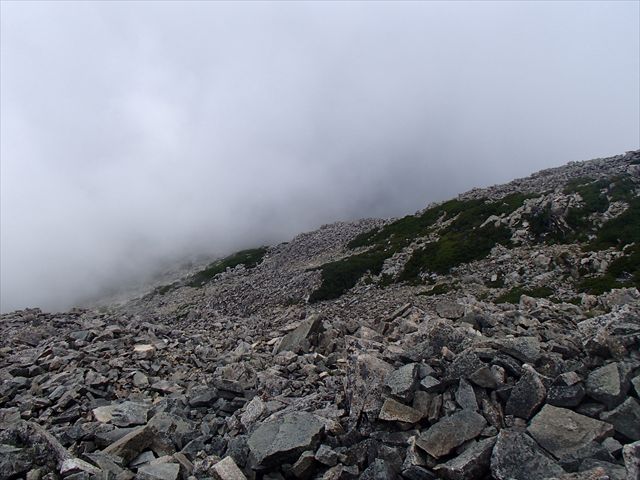 岩ゴロ、岩屑の上を歩き山荘まで下山します