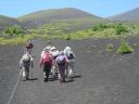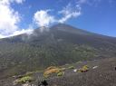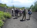 【 期 日 】 8月7日(日) 【メンバー】 L=T,M SL=T,K M,K T,M N,M T,H S,N S,F R,S 【コースタイム】 新座駅6:30発 → 御殿場口新五合目第三駐車場10:00〜10:20 → 第一駐車場10:30発 → 登山口10:40発 → 大石茶屋10:50〜11:00 →二ツ塚下11:45〜11:50 →二ツ塚下塚12:00〜 12:10 → 二ツ塚下12:15〜12:20 →二ツ塚上塚12:45〜12:50 →二ツ塚下(昼食)13:00〜 13:25 →四辻13:35 → 幕岩13:50〜14:00 → 登山口15:00 ※通称:双子山と言われるが、国土地図情報及び林野庁富士山自然休養林ハイキングコース・マップに 準拠して表示を統一しました。 【コメント】 参加者数が少なかったので乗用車2台に分乗し出発した、夏休みに入り車も多い。 富士登山駅伝大会の影響で少し遅れ、御殿場口新五合目駐車場に到着。 眼前に大きな富士山を見ながら日差しの強い砂礫の道を登る。立ち止まると涼しい風が吹き抜け気持ちよい。 やがて二つのコブ(二ツ塚=双子山)の鞍部(二ツ塚下)に到着。鞍部にザックをデポし左手の小さな砂山のような 二ツ塚下塚に登る。 頂上には小さな鳥居と崩れかけた記念碑のようなものがあった。 ここからの眺めは良く背後に夏雲の湧きあがる中、二ツ塚上(上双子山)、宝永山、富士山が重なって見える。 また御殿場市街、山中湖、愛鷹山方面の展望も良かった。 歩き足りない人はさらに二ツ塚上(上双子山)に登った。残った人は鞍部に戻ってのんびり昼食をとりながら帰りを 待った。 四辻からは交差する須山口下山道を下っていく。やがて樹林帯に入り今までとは雰囲気が一変する。 幕岩は溶岩流が固まって出来た川原のような所にある大きな岩のことらしい。 ここからは登山口まで緩い傾斜の良い道が続いていた。(T,M) |