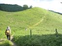 | 松川ICから黒川牧場までマルモタクシーの運転手にすべてを任せた。大鹿村中心部から鹿塩温泉経由黒川牧場への道は「大池高原中村農園のヒマラヤの青いケシ(メコノプシス)開花の時と秋の唐松林黄葉の時は観光客で混雑する」という。その期間は林道も休工とのことだ。黒川牧場の入り口までは徐々に道幅が狭くなるが舗装されていて快適だ。 黒川牧場入り口の人気のない小屋(牧場管理舎らしい)前からダートの牧道が始まる。ガタガタの急な電光道で、運転手も「タクシーの限界」というくらいだ。轍跡が続く牧道はさらに二児山と黒河山と左右に分かれている。すこし左に行って天空の池と大鹿村二児山遊歩道マップ大看板が目印の駐車場に到着した。松川ICから天空の池駐車場まで01:15、料金約\14000であった。 なお駐車場は黒河山側にもう1箇所ある |