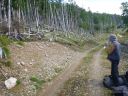 | 樺山の山頂尾根には先行した慶大WVの踏み跡がところどころ残っていた。倒木上の苔剥離はいい目印だった。2160m(等高線)のコルに下って登り返す。目前に急斜面が迫る2210m(等高線)で休憩をとって貰い、改めて針葉樹疎林の中、標高差100mを急登した。急傾斜の尾根が終わったら今度は倒木を数多く跨いで登らなくてはならなかった。倒木の殆どは東に向かって倒れていた。予想していたより短時間で小黒山山頂に上りついた。山頂には久しぶりの赤テープがあり先行したQさんがその近くでメモをとっていた。この山頂も針葉樹林で展望がない。10分休憩を頂いて南南東に下った |