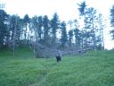 | 重い大ザックを背負って天空の池から黒河山へ遊歩道を登った。看板通り、丘の上に駐車場がもう一箇所あった。「ここまでタクシーで運んでもらって大ザックをデポしていたら」と背中の重さを恨む。どんどん離れていくQさんを追いかけて遊歩道をよろよろと(体調不良のせいもある)登り続けた。GPSと地形図をにらんでいるQさんに追いついてザックをデポし、空荷で遊歩道から斜面を稜線に登る。稜線にでて左手のわずかな高みを目指して歩んだ。先行したQさんから声がかかる。 黒河山(V2127.7m)の 山頂である。参考情報の通り「保安林」黄プレートがあった。やはりここもシラベ林に囲まれて展望はまったくない。登頂したことに満足して遊歩道へ下った。 再び重いザックを背にしてのろのろと歩き出した。20分ほどで遊歩道末端の笹山(2121m)休憩舎に到着した。ここまで轍跡が続いている。休憩舎の向かいには黒河山からの尾根道が下ってきていた。先行していたQさんが「どうにも入り口開き戸が固くて入れない。裏窓は開く」という。テント持参だがどうするか・・・・・ |