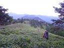 | 笹山休憩舎を5:00に出発して朝露が降りた笹原を進む。笹は低いところで膝の高さ、次第に腰の高さになった。空も笹原も明るくなってヘッドランプの世話にならないですむ。東天は朝焼けをしていた。重かった水も行動分だけになったのでザックも担ぎやすい。疎林に笹原が広がる平坦な笹山、 山頂はどことも分からぬまま通り過ぎた。鹿道かもしれないが踏み跡は笹原にしっかりついているのだが・・・ |