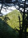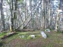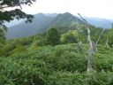 | 入山の頂上尾根からは立ち枯れ、倒木帯や薮が幾重にもある。いよいよという感じである。狭い尾根からは西側に連なる山々が見通せた。「どの尾根が大日影山〜昨年登ったか小日影山か」とQさんと話し合う。標高差が少ないもののアップダウンがこの先にも続く。まずコルから薮めいた針葉樹林の急斜面を木の根・石・細木を掴んでを登った。 2166m峰からはこれから登らなくてはならない「樺山〜小黒山の尾根筋」が目で辿れた。下りの薮にビニール傘が捨ててあった。人の気配にほっとしたが薮抜けで雨具を残さざるを得なかったのかと同情した。 地形図通りの細尾根に入った。右手はガレになる。キオンだけでなく、タテヤマオミナエシの群落が足元からザレ・岩のガレ崖の途中にあった。細尾根には岩場があるのではと覚悟していたが、幸運にもそれは裏切られた。 コルの薮から標高差100m近い急登が始まる。いつものように急斜面の上下はQさんに先行してもらってTIはマイペースで追いかけた。 どうにかQさんが寛ぐ樺山(2285) に登り着いた。Qさんが指差す先には「慶応義塾大学WV部の板」が結び付けてあった。、なんと昨日、ここを通過したらしい。分杭峠から本谷山縦走は関東の大学WVにとって貴重なルートなのだ。 樺山の山頂は針葉樹の高木と幼木の薮に囲まれてなんら展望はない |