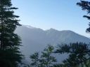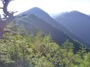 | コルから標高差80mの急登をこなして2460m峰(等高線)に登り、南東に下った。ここから2394m峰を挟んで二重山稜がある。右左どちらにも踏み跡(人や獣の)があるがたとえ山稜末端で行き詰っても慌てずちょっと引き返す余裕があればルートにでる。途中では南アルプス北方主稜線が見え、郡界尾根の枯木・倒木帯の先に本谷山が聳えているのも望める。 |