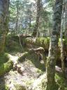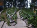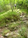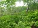 | 休憩舎から笹原に入る。笹は低いところで膝の高さ、次第に腰の高さになる。朝露に濡れないよう雨具ズボンとスパッツは装着していた方がよい。尾根分岐は笹山の下りにあるが南西に迷い込まないよう南東の踏み跡をトレースする。コンパスと高度計は必携、GPSはあればよい。「古典的に山登りする」とこだわるのなら鹿道も含め踏み跡は笹原にしっかりついているので地形図とコンパスで努力すれば全うできるよう。笹原にシラベや広葉樹の薮生えている場所の前後には倒木が笹に隠れている。注意が必要である。もちろんTIは傷だらけになった。 標高差が少ないアップダウンが続く。疎林に入ると林床が丈の低い笹などで覆われているだけなので朝露の心配はなくなる。樹林中は苔むして滑りやすいが踏み跡がしっかりして、笹原より歩きやすい。何よりも倒木が見えるので安全だ。入山の登り尾根西側は崩落あるいは崖である。それらに踏み込む必要はなく尾根樹林の中の踏み跡や水流跡を辿って進めばよい。入山まではところどころの目印テープも助けてくれる。 |