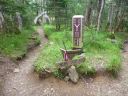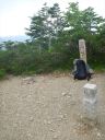 | 今度も分岐から赤テープに従って東峰に向かう。おかげで迷わず、すぐに東峰に登り着いた。 東峰山頂には三角点(2243.0m)、倒れた御料局三角点、絵も字も失せた展望説明パネルなどがあった。切り開きから、一方には分杭峠〜二児山縦走路、他方には南アルプス主脈縦走路の峰々(つもりだが)、近場では西峰を見た。懐かしい伊那富士と美和湖が見えた(つもり)。もう少し切り開きが大きければ・・・ |