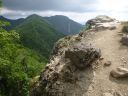 | 「鳥倉林道まで1km」道標に下ってきてデポしたザックを担いで林道へ下る。「三合目(3/10)」を過ぎると樹林がカラマツに代わる。「二合目(2/10)」、「一合目(1/10)」道標を見ればすぐに林道広場を見下ろすことができる。鳥倉林道バス停脇には仮設公衆便所や「登山道沿いの岩石」看板がたち、登山道の方を見ると「豊口ルート」と記した道標などがある。左手には石灰岩の大岸壁が聳え、その下には小石が散らばっている。谷側の木立の上には南アルプス支脈や前衛の山々の稜線が重なって見える |