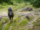 旧三伏小屋跡が出てきた。いたましい。三伏沢本流は涸れ沢であった。対岸の三伏沢右岸の沢を豊富な水がほとばしり落ちている。水場でたっぷりと水を飲み、明日までの水も補給して再び重くなったザックを担いでQさんを追った |