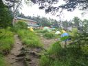 | 水場で、明日までの水も補給して再び重くなったザックを担いで三伏沢に沿って登る。20分ほどで三伏峠小屋の水場小屋脇に着く。より硬く踏み固められた道を登るとまず烏帽子岳分岐に、道標に従い樹林帯を進むとついで三伏峠に着く。分岐の道標をじっくり読んで三伏峠小屋に向かう。テント場の先が三伏峠小屋である。小屋の前にも三伏峠の標看板が立っている。幕営手続きを受付でして料金(\700/人)を払い、渡されたテント札を設営したテントに結べば本日の縦走は終わりである |
