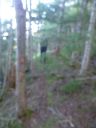 | 分岐から西峰へ針葉樹林苔の道を進むとすぐに急斜面に突き当たった。2〜3分頑張れば西峰の頂上尾根に出る。防火の赤い幟が立っていたが目立った山頂標など見当たらず山頂探しに尾根を端まで進んでみた。分杭峠からの縦走路であるせいか、はっきりした踏み跡が延びている。背後からQさんの声が「山名標がある」と教えてくれた。引き返してみると二児山西峰の頂上はなんと赤い幟があった場所だった。 頂上でひっくり返って休憩する。微風で涼しい木陰で次々とリレーするルリビタキの囀りを楽しめた。 が、頂上はシラベ林に囲まれて展望がまったくない。 息が整ったので東峰に向けて下った |
