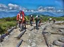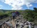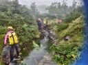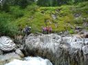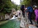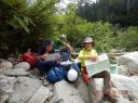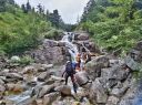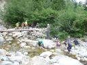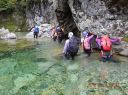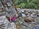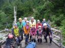 | 期日:8月14日(日)〜16日前夜発 メンバー: N/K U/M L:H(会員外) 他県連沢ネット7名 コースタイム 8/14 7:25折立登山口―11:29太郎小13:00―薬師沢小屋15:00 8/15 6:30薬師沢小屋―6:46渡渉点入渓―8:22出合が見えるー8:23へつり開始―8:25出合―10:45大滝―11;52赤木平13:30―14:50尾根(着替え)15:15−北の俣岳15:22―太郎小屋16:42 8/16 7:42太郎小屋―10:00急勾配ポール標識―11:33登山口着 コメント 沢ネットで今年は赤木沢に行くようだとの情報を得て、ぜひ参加したいと思っていた。テレビで赤木沢遡行を試みた映像を見てから、その沢の水の美しさにひかれたからだ。 8/14(日)今日は薬師沢小屋まで。折立から登り、太郎小屋では1班の到着まで休憩。太郎小屋から薬師沢小屋は基本下りなので、あっという間に小屋に着いた。ここでも、しばらく1班の到着を待つ間ビールでのどを潤す。夕食前に全員集合してテラスでまたまた1杯。明日の天気が心配だが・・・・。 8/15(月)水が冷たいので6:30分出発となる。赤木沢出会いまで、緩い渡渉を繰り返す。8:25出会いが見えた瞬間感動した。右側をへつり、ナメ、二段の滝、三段の滝、滝 、滝、滝と、滝の遡行が続いた。大滝に出て その大きさに感動!みんなで写真を取ってここまでこれたことを喜んだ。これから先は赤木平に出るために遡行がつづく。いくつか入り口があったが、慎重に最短の1本を選びうっすらとした踏み跡をつきあげていく。11;52突如広場に出た。赤木平は広々とした高原のようなとても素敵な所。天気も回復して来たので、予定通りソーメンを作り食べようということになり、そうめんのお湯が沸く頃、何と皮肉にも大ぶりの雨。一時ツエルトに避難し、ツエルトの中で出来上がったソーメンをいただく。そうこうしているうちに雨は止んだので、尾根に登ります。沢の遡行が何箇所かあるので、沢靴のままです。急騰の斜面を登り、途中のハイマツ帯を藪こぎし、沢靴なので滑る滑る。 やがてハイマツ帯を通過すると、槍が岳が後ろに見えてきました。天気 は太陽が顔を出し、完全に回復。ガスも取れ、360度の展望です。素晴らしい眺め!! 雲海の中に山々が浮かびます。この尾根上で、靴を履き替え、身支度を 整え、2661mの北の俣岳に向かいました。10分も歩かないうちに到着。すごいルートをリーダーは地図を開いて研究していてくれました。みんな嬉しくて、にこにこしています。 足取り軽く太郎平小屋へ向かい、太郎平小屋の赤い屋根が眼下に見えてきたときには「楽しかった1日が終わっちゃうんだな〜」と感じました。 小屋の前で、小屋泊組みとテント泊組に分かれ泊ることにしました。夕食は自炊室でメンバー全員で頂きました。 夜寝床で「今日は遡行図を何度も開き、よく現在地を確認し、見ながら遡行した。」自分が、少し成長できた、と満足感に浸りました。 8/16(火)7:42下山開始です。今日もよい天気です。 3時に起きて、薬師岳に夜明けを見に登った仲間もいました。 11:34太郎平から登山口につきました!真っ先に自動販売機に駆け寄りましたが、ゼーン部売り切れ!残念!!そういえば前回の去年もそうだったっけ。 お疲れ様〜。 沢ネットの仲間の皆さんお世話になりました。 N/K記 写真 |