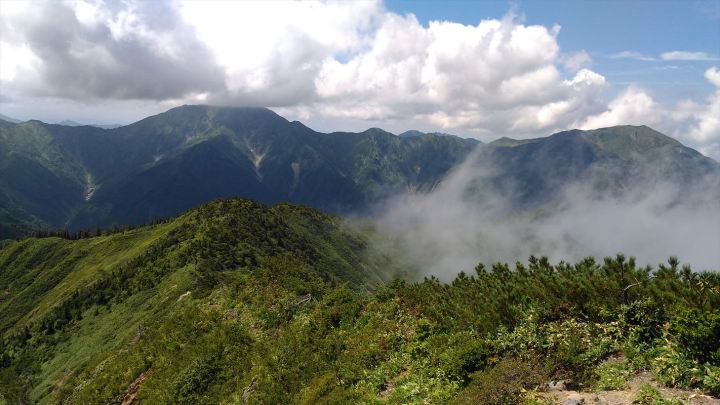 山頂から続くのは兎岳への緑の尾根 雲を被った中ノ岳と右の越後駒の間に小さく八海山のギザギザが見えます