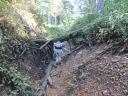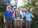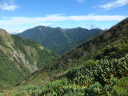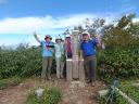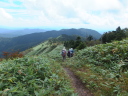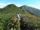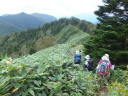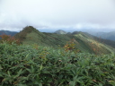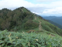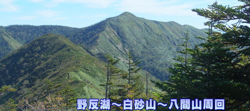 | ↑ 堂岩山直下から見る白砂山 【期 日】 2016年9月10日(前日発) 【メンバー】 CL:I/K M/I T/K N/M 【コースタイム】 野反湖Ⓟ(1530m) 5:30 → 地蔵峠(1600m) 6:25~6:30 → 水場7:55 → 堂岩山(2051m) 8:35~8:50 →分岐 8:55 → 猟師ノ沢ノ頭 9:20 → 白砂山山頂(2139.7m) 10:30~11:00 → 猟師ノ沢ノ頭 11:55 →分岐に戻る 12:15~12:30 → 中尾根ノ頭(1944m) 12:50 → 黒渋ノ頭(1895m) 13:45~14:00→ 八間山(1935m) 14:30~14:45 → 茅ノ尾根経由 → 車道出会い 15:55 → 野反湖Ⓟ 16:10 【コメント】 白砂山ピストンではなくロングの周回コースだったので、覚悟を決め、モチベーションを上げて参加した。 金・土曜日と天気は良い予報でピッタリ当たった。 前夜は、湖畔の建物の中にテントを張る事が出来、ラッキー ! 思ったのもつかの間・・・。単独で来ていた男性の想像を超える鼾で、Kさんは一睡も 出来なかったと・・・。 登山口からは緩やかな登りで、間もなく半ノ木沢に 下りた。 地蔵峠からはダケカンバの樹林の中、いくつかの ピークを超え堂岩山へ。 山頂を過ぎると間もなく目指す白砂山が姿を現し、稜線もくっきりと望め、奥深い静寂な 山容や周囲の山々が見渡せた。 ガイドブックでは稜線漫歩と書いてあったが、上り下りを繰り返し、やっと山頂か と思いきや三回ほど騙されて、到着。山頂は360度の展望で、近くには榛名山、 日光白根山や苗場山も見ること が出来た。 分岐まで戻り、八間山に向かう。中尾根ノ頭の先だったか一カ所、道が分かりにくいところがあったが、特に危険 な所も なく、静かな山歩きを楽しめた一日だった。 (N/M記) |
