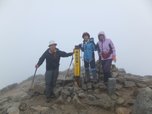 翌朝、唐松岳に登りました。残念ながらガスって何も見えません
