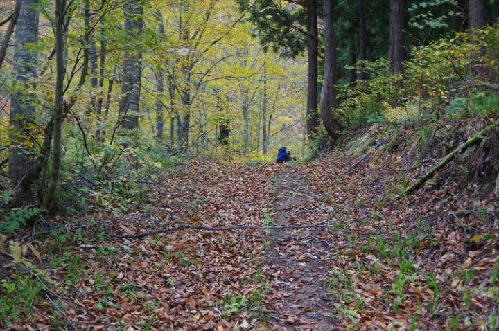 落ち葉と黄葉の林道を進む