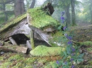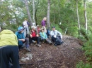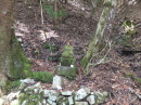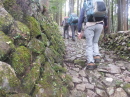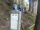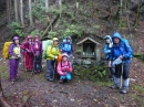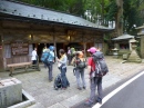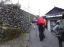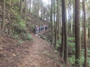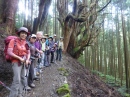 | 今日のコースは殆ど山道歩き。最も高い伯母子岳へ登るので、展望も期待出来、晴れて欲しいとの皆の願いも空しく、朝から小雨・・。 途中で合羽を着て杉林の中の急登を黙々と登ります。高野山は高野槙の大木が多かったが、熊野古道は杉の大木と苔蒸した道。 分岐を伯母子岳へ。雨のため360度展望無し、残念!避難小屋があり、そこで民宿で作って頂いたお弁当で昼食にします。 伯母子岳を後にして小一時間行くと、平坦な場所に広く石垣が残っている旅籠・上西家跡に着く。説明板によると、ここは江戸初期まで街道上の旅籠で、伯母子峠を越えて馬に荷を積んで旅人も多く大賑わいだったとか。昭和9年頃まで人が住んでいたとは、こんな山深い所に?と信じられません。先には茶屋跡もあります。アプローチの交通もままならないのに、平安時代から続き、「蟻の熊野詣」と言われた時期もあって貴賎を問わず熊野に詣でた古の人々の信仰心に驚嘆します。県道に出て神納川に沿って五百瀬(いもせ)のトンネルを抜け、三浦口バス停近くで、今宵の宿の農家民宿「山本」に電話をかけ迎えをお願いする。 (T.K記) |